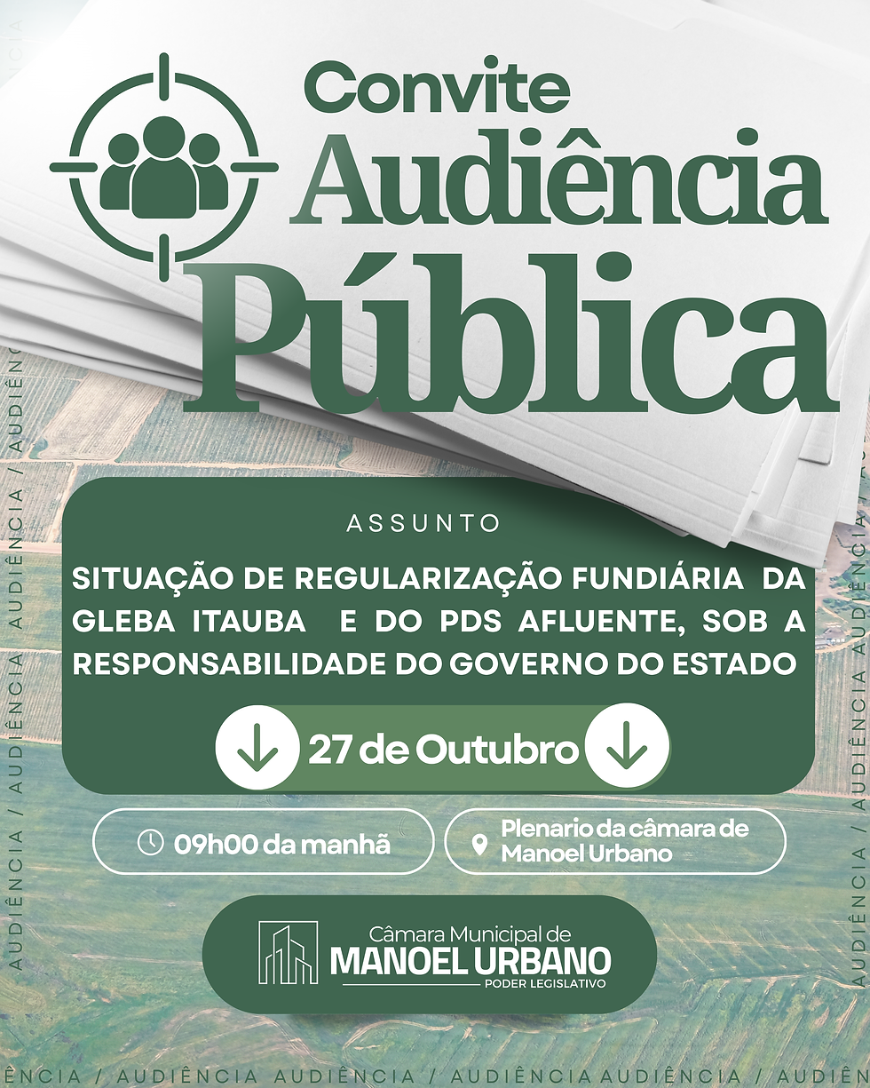 A Câmara Municipal de Manoel Urbano convida toda a população para participar da Audiência Pública sobre “A Situação de Regularização Fundiária da Gleba Itaúba e do PDS Afluente, sob a responsabilidade do Governo do Estado.”